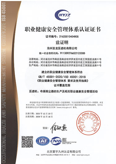 职业健康安全管理体系认证证书