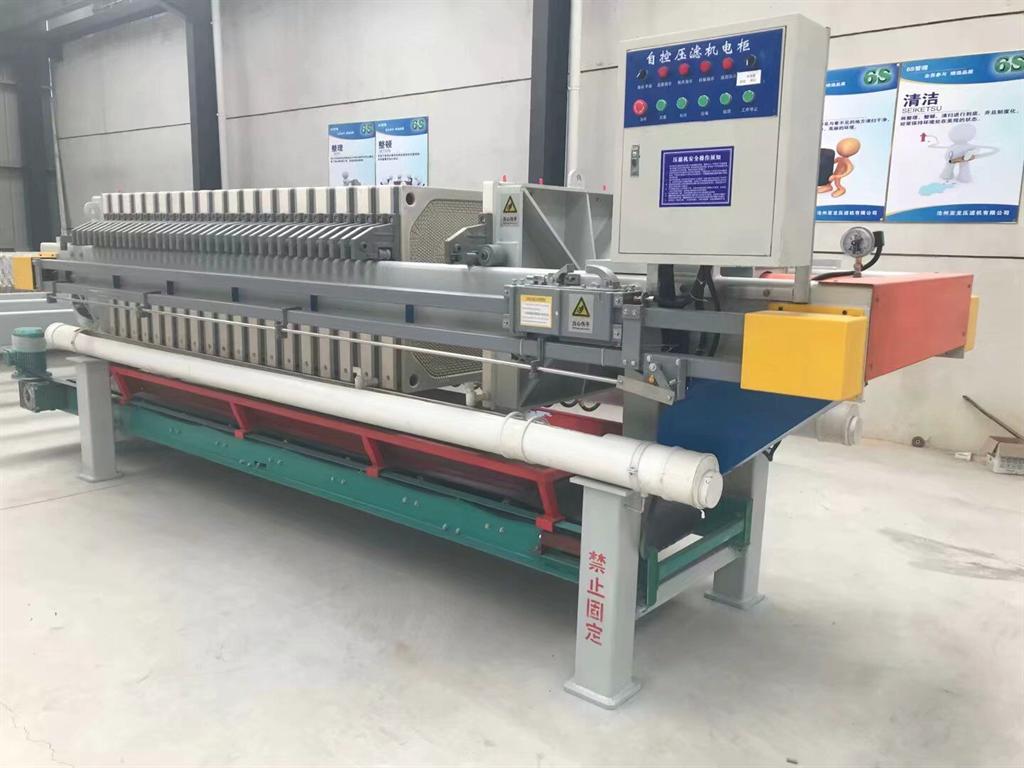 接下来把过滤介质铺没在滤板上,料浆通过中心或环状加料管导入滤板上表面,进行连续过滤。当过滤进行到所要求的滤饼产量或由于滤饼的阻力使过滤速率低到预定值时,过滤过程结束。某些水平板式压滤机在底部设计了_板。过滤过程结束后,必然有一些残存料液,可月洗液置换或空气吹除。洗涤和反吹过程如同加压叶滤机。卸料时,将滤板组件从壳体内抽出后刮除滤饼。有些压滤机在适当位置设计了水喷头用来冲洗滤板。